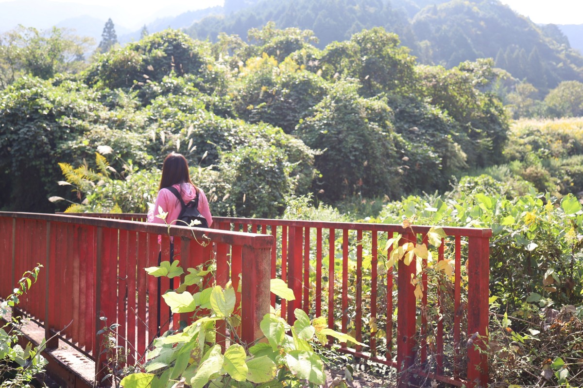 道なりに進むと赤い橋が見えるので、渡ってさらに進んでいきます。