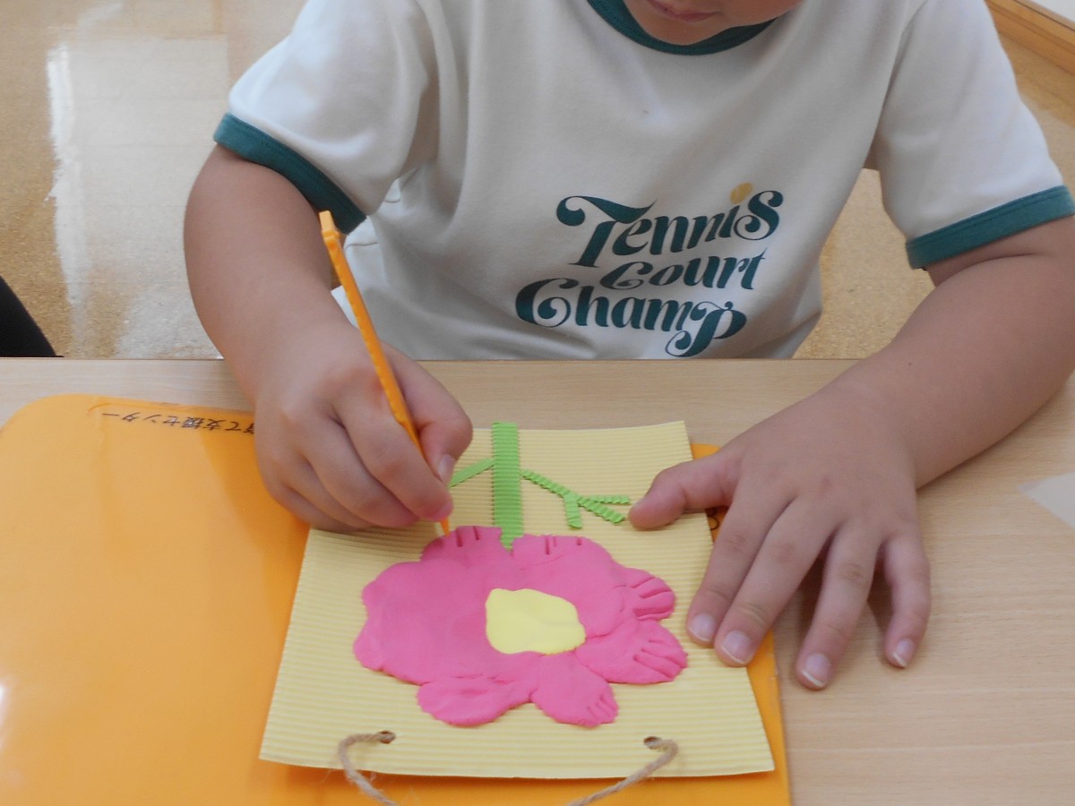 自分のペースで、一つの粘土をちぎって8枚の花びらにし、花をつくりました。