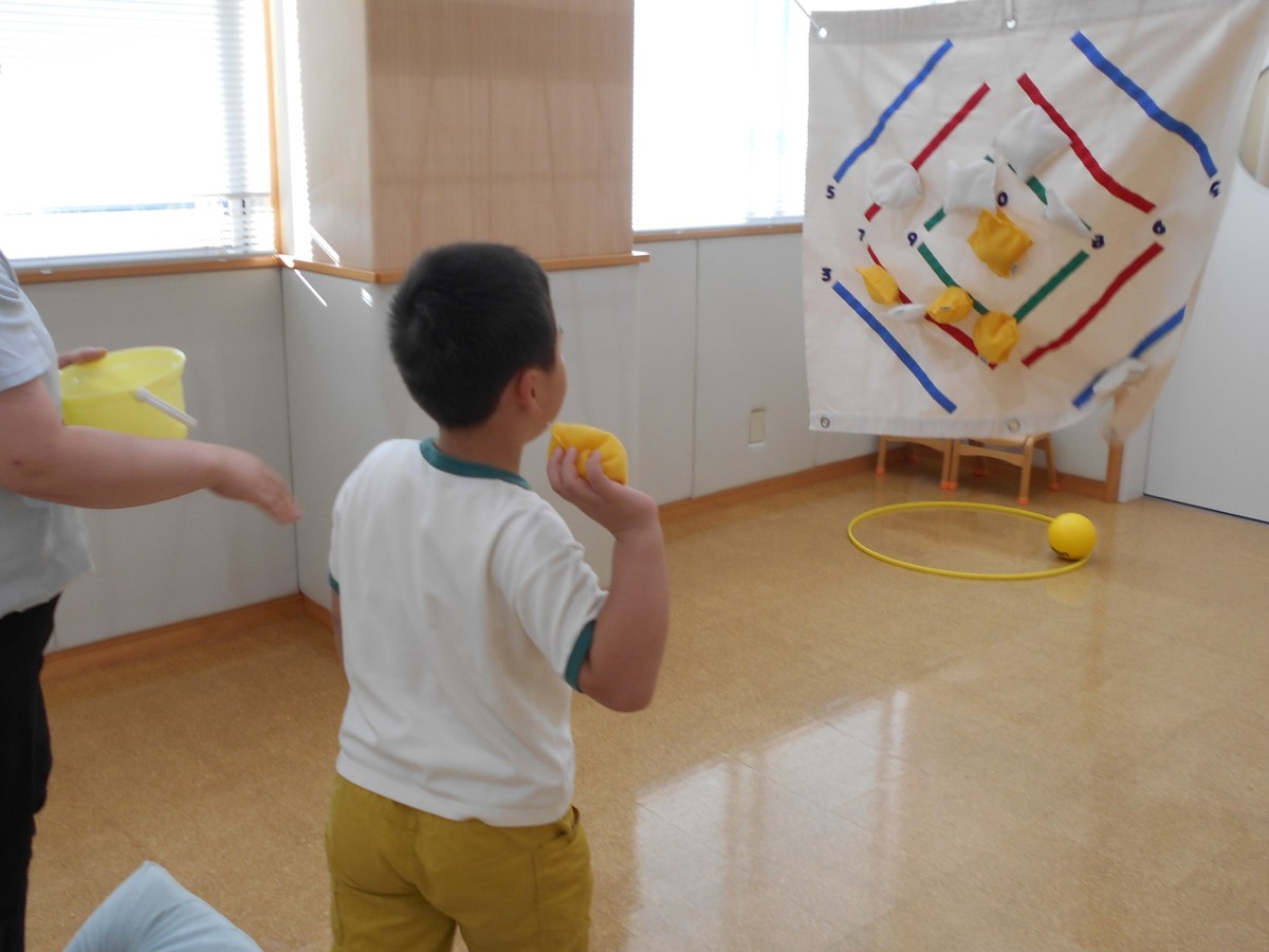 目と身体の動きを合わせる“協応”を意識しながら、力を抜いてゆっくりと投げる練習も行いました。